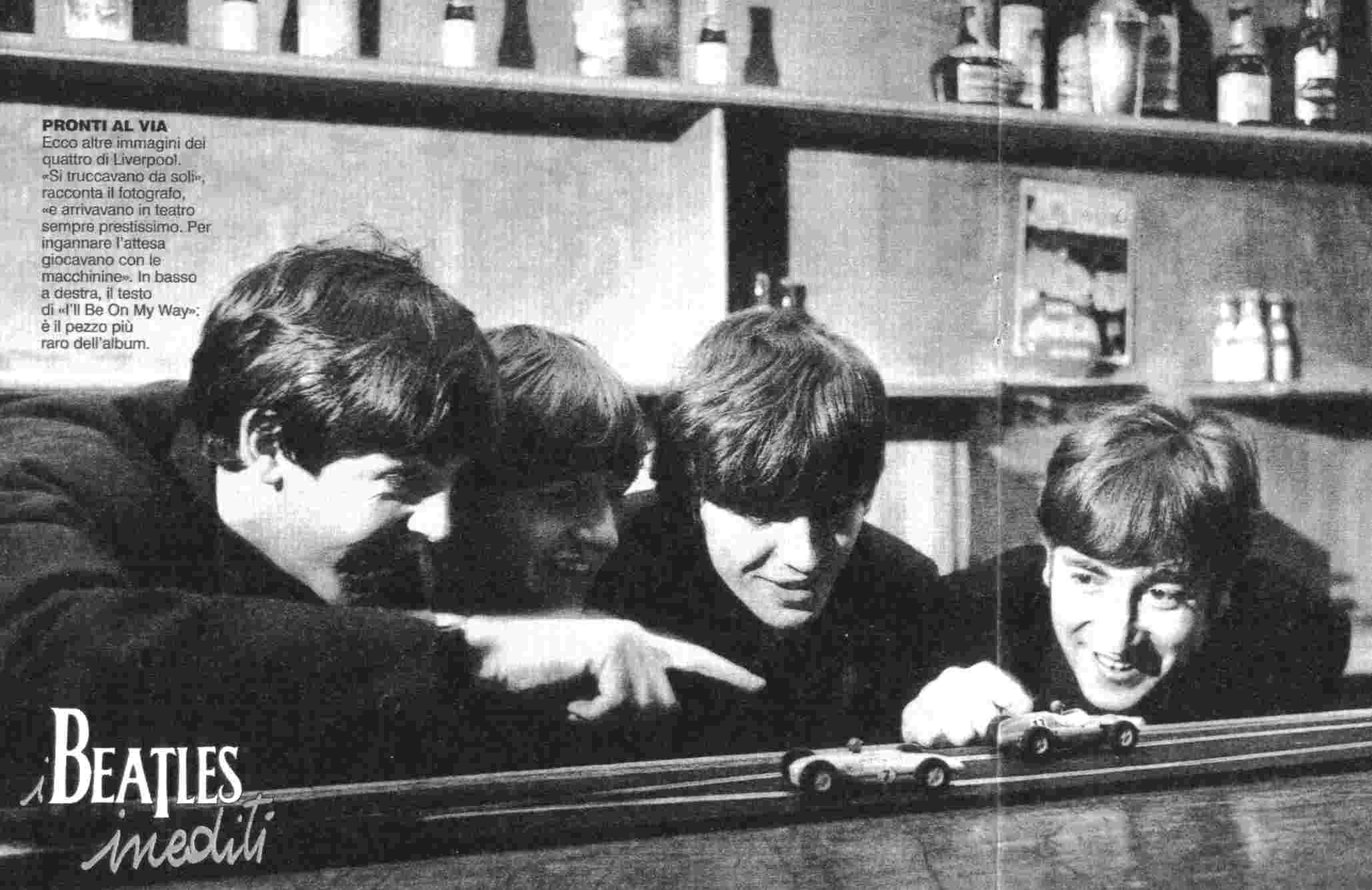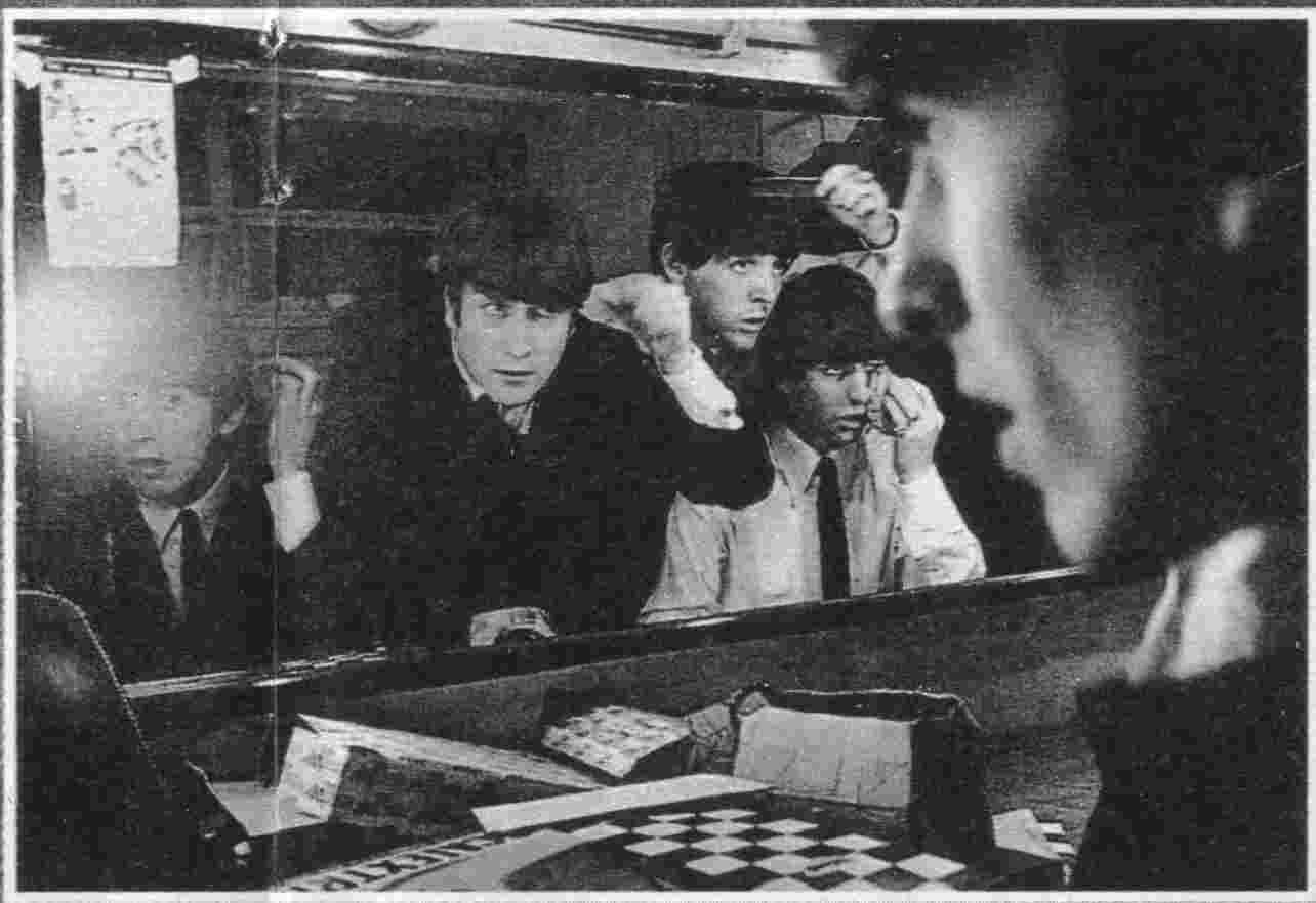 Beatles in the dressing room; on the table you can see a Scalextric box