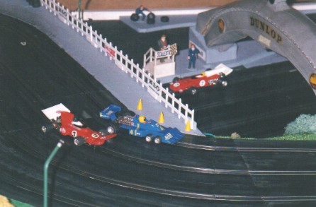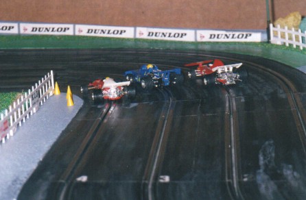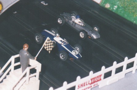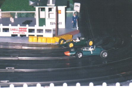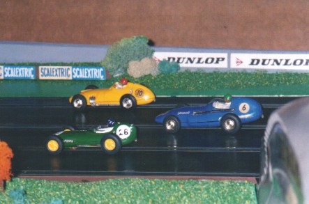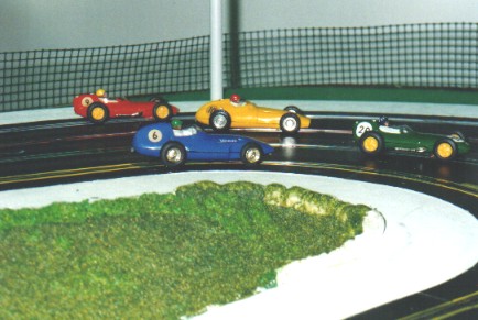 Fifties formula one: Vanwall (blue) - Lotus 16 Graham Hill (dark green) - BRM P25 (yellow) - Lotus 16 (red)
