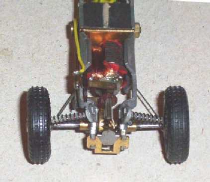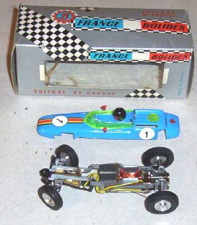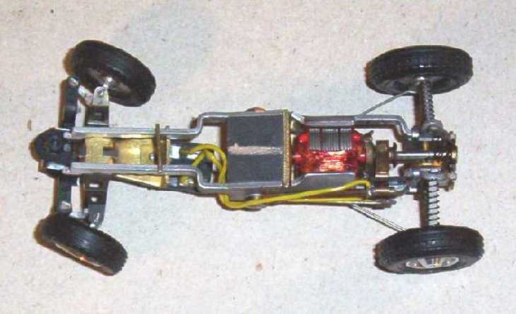 In the sixties a French manufacturer (France Bolides) made this particular 1/32 scale model. As you can see, the car is provided with operating steering front wheels. But the real rarity is the indipendent wheels rear suspension, with semiaxles and operating springs. Pinion has helicoidal tooths! Body is a formula one Porsche (not cool as chassis!) |