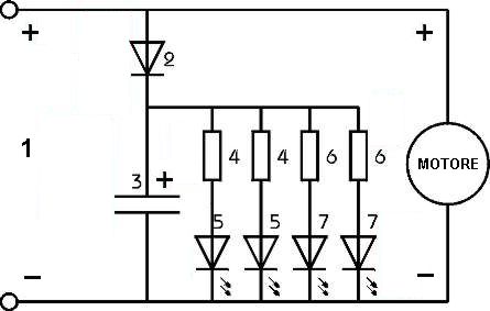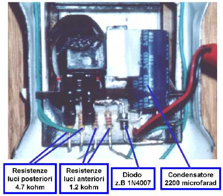 2 - n.1 diodo z.B. 1N4007 3 - n.1 condensatore elettrolitico da 2200 microfarad 4 - n.2 resistenze da 4,7 k ohm 5 - n.2 diodi rossi piccoli per luci posteriori 6 - n.2 resistenze da 1,2 k ohm 7 - n.2 diodi bianchi da 5mm per luci anteriori (effetto xenon!) Il condensatore mantiene le luci accese per circa 2 sec dopo che manca l'alimentazione; ciò consente di avere le luci sempre costanti anche nelle staccate più lunghe! |