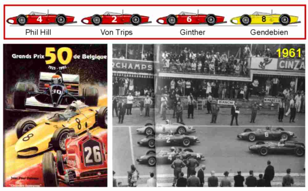 In the second pic, Gendebien Ferrari n.8 overtakes at "La Source" Phil Hill Ferrari n.4.